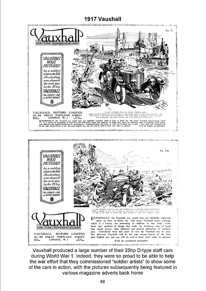 (c) auto-heritage Vauxhall produced a large number of their 25hp- D-type staff cars during World War 1. Indeed, they were so proud to be able to help the war effort that they commissioned "soldier artists" to show some of the cars in action, with the pictures subsequently being featured in various magazine adverts back home
