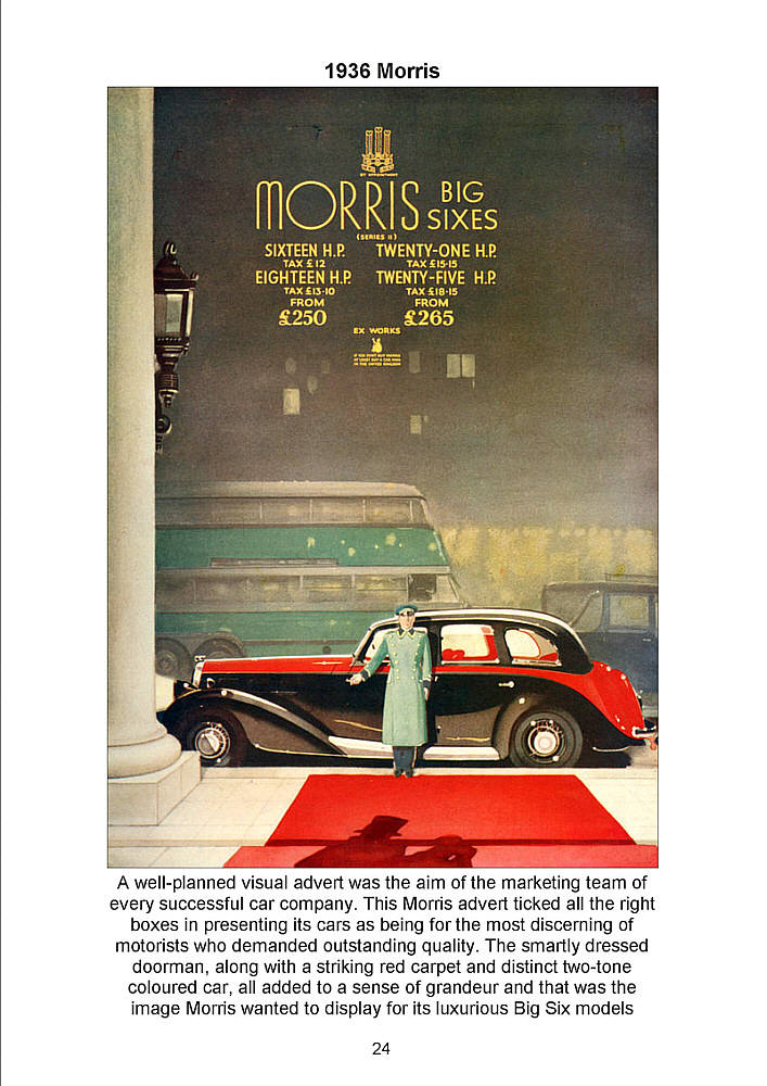(c) auto-heritage A well-planned visual advert was the aim of the marketing team of every successful company. This Morris advert ticked all the right boxes in presenting its cars as being for the most discerning of motorists who demanded outstanding quality. The smartly dressed doorman, along with a striking red carpet and distinct two-tone coloured car, all added to a sense of grandeur and that was the image Morris wanted to display for its luxurious Big Six models |