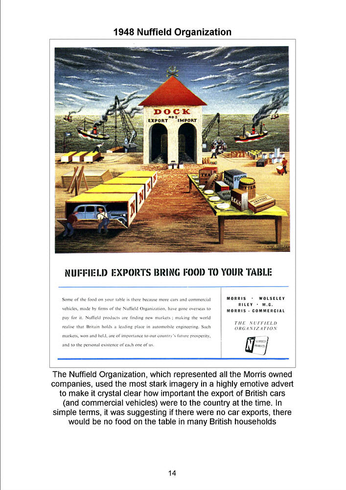 (c) auto-heritage The Nuffield Organization, which represented all the Morris owned companies, used the most stark imagery in a highly emotive advert to make it crystal clear how important the export of British cars (and commercial vehicles) were to the country at the time. In simple terms, it was suggesting if there were no exports, there would be no food on the table in many British households |